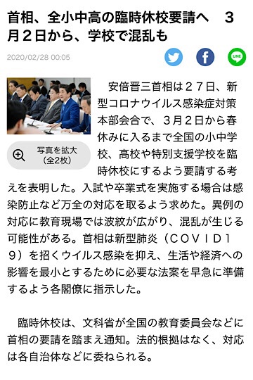 安倍総理が3月2日から全国の小中学校に休校の要請を発表。