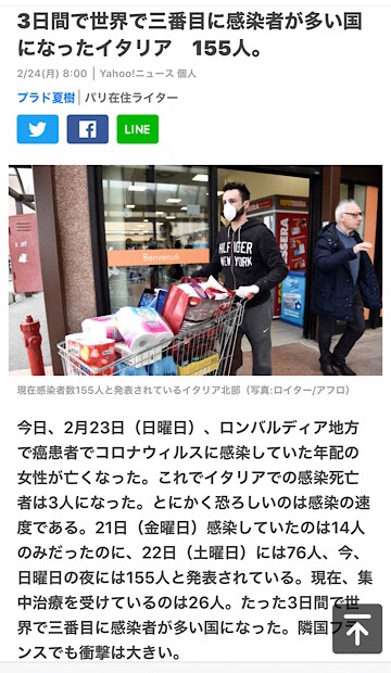 イタリアでここ3日間で急に感染者が増えている。
