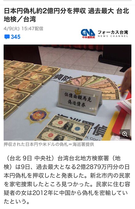 台湾で偽一万円札二億円分発見された